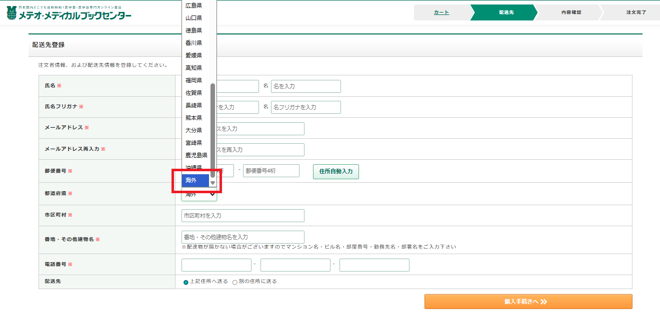 一番下に「海外」の選択肢がございますので、そちらをご選択のうえ住所をご入力ください。