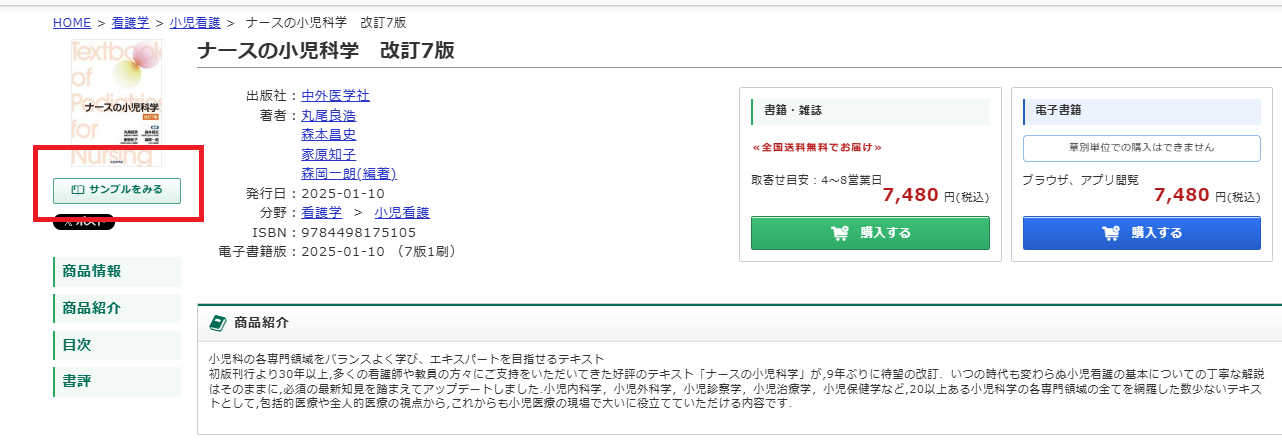 電子書籍で配信されている商品については、「サンプルをみる」ボタンから中身を一部確認することができます。