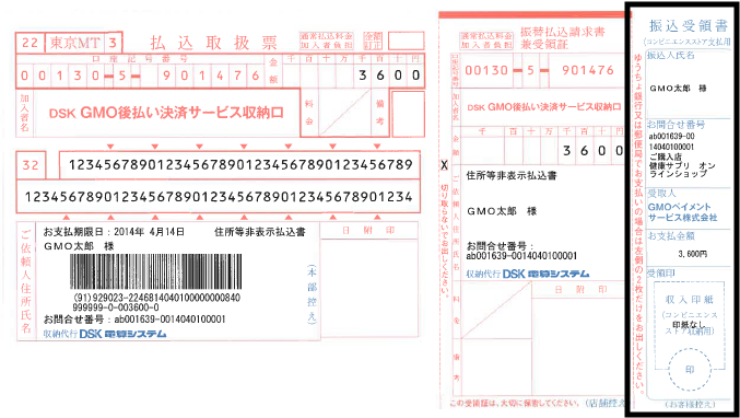 「コンビニ」:後払い請求書の「払込受領書」を証書としてご利用ください。※下記参照
