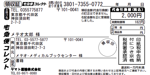 領収書の金額は代引金額(商品代金・送料・代引手数料・消費税含)となります。