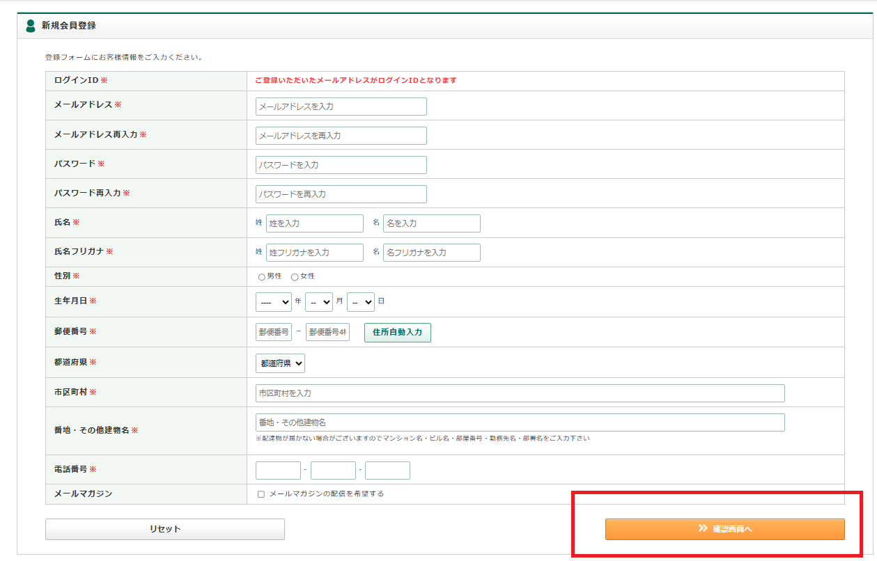 メールアドレス、パスワード、氏名、氏名フリガナ、性別、生年月日、ご住所、電話番号をご入力ください。