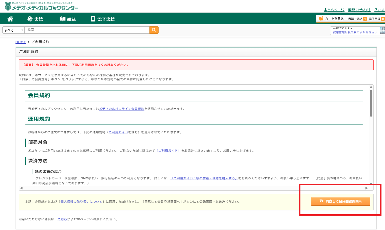 【2】「ご利用規約」をお読みいただき「同意して会員登録画面へ」ボタンをクリック