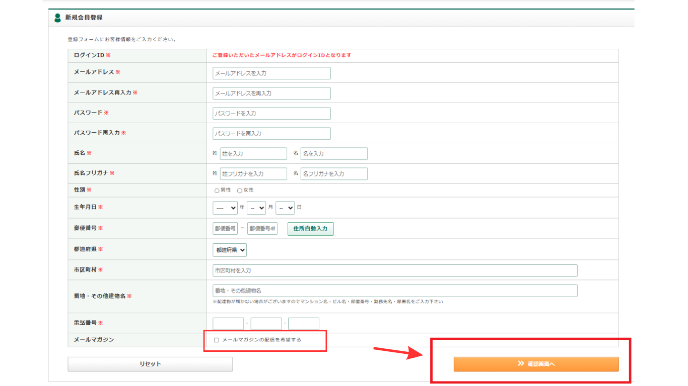 【3】お客様情報を入力し、一番下の【メールマガジンの配信を希望する】にチェックを入れ、「確認画面へ」ボタンをクリック。画面に沿って登録を完了させてください