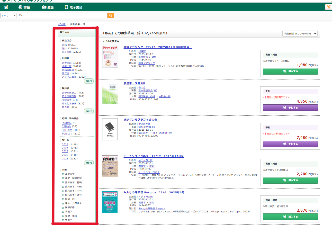 商品の形態や、雑誌名、分野など、検索範囲をさらに絞り込むことができます。